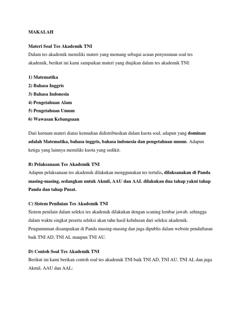 Karena tes psikologis dapat diartikan juga sebagai sebuah prosedur sistematis. Panduan tes masuk prajurit tni pdf free download. Tes akademik tni contoh soal tes akademik tni ad pdf contoh soal tes akademik secaba tni ad download soal soal bintara. Home psikotes tes psikologi download contoh soal tes kraepelin. Persiapan untuk lolos taruna akademi kepolisian terbaru.
